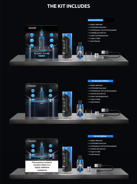 TFV9 Mini tank (2ml) is one that SMOK have been pairing with the TPD kits in Europe. Performance is exceptional thanks to the V9 Meshed Coil and V8 Baby Q2 coil which make incredible, flavorful clouds. SMOK Rigel has a soft rubberized finish which is grippy and makes it a delight to hold.